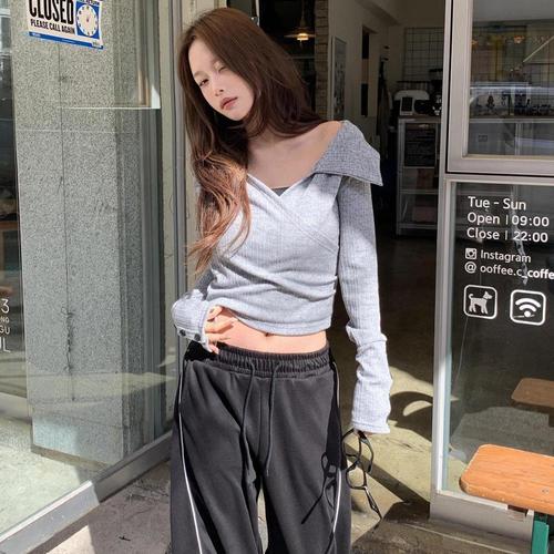 [옷자락]여성 끈 나시 오프숄더 골지 소매 버튼 긴팔 니트