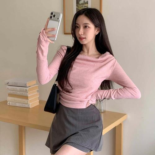 [다잇템]여성 잔주름 랩카라 단추 소매 슬림핏 니트