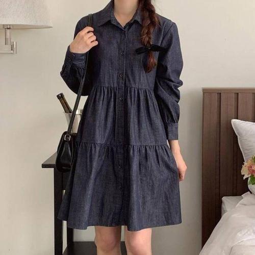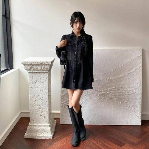 [에이치플러스몰]여성 롱니트 셔츠 쉬폰 데님 미니 원피스 하객