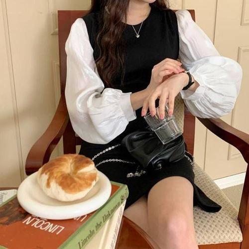 [에이치플러스몰]미니 롱니트 밴딩 쉬폰 뷔스티에 주니아 셔츠