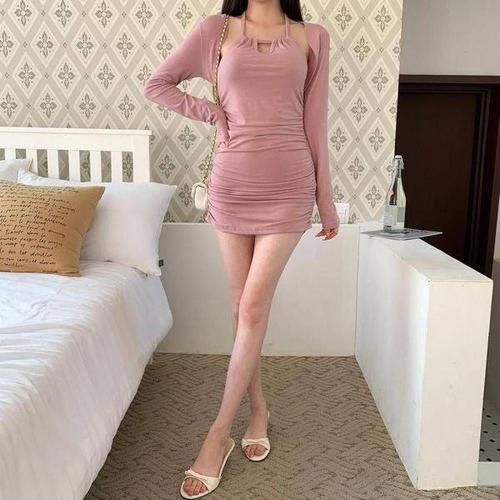 [하프클럽/]트렌디 플리츠 여름철 아우터니트 긴소매 재킷 미니드레스 레이