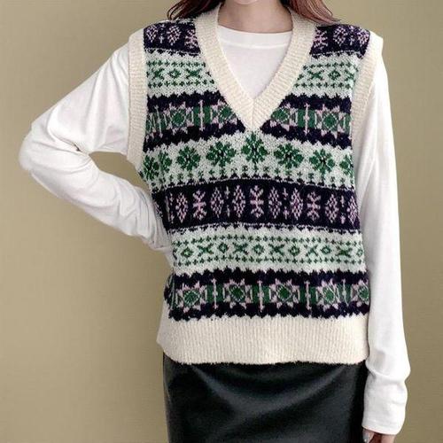 [신상오픈런]여성 알파카 꽃무늬 자가드 스트라이프 브이넥 니트 조끼