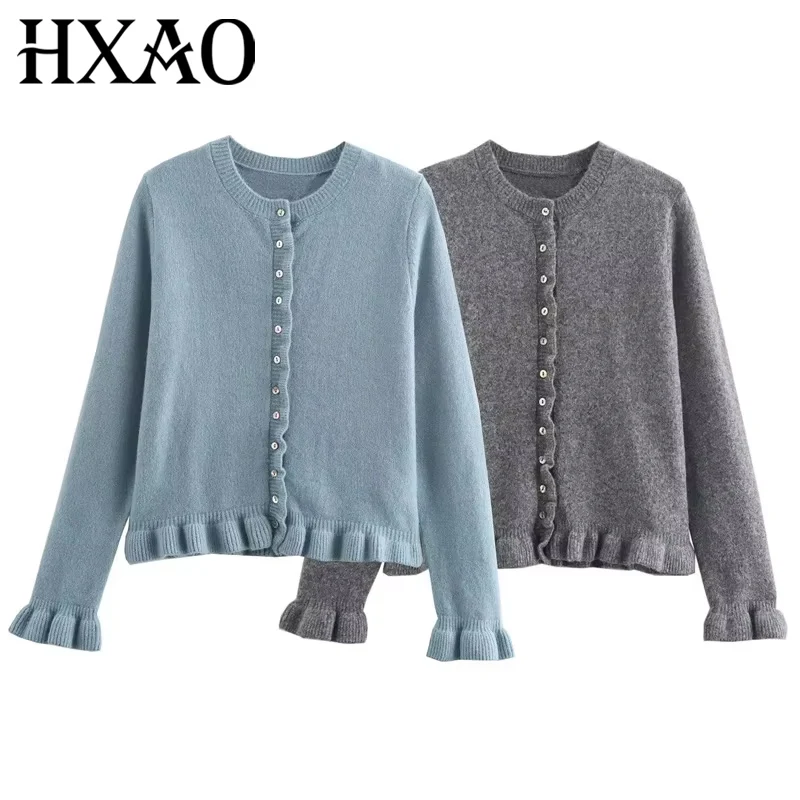 HXAO 스웨터 카디건 러플 긴 소매 니트 카디건 여성용 가을 볼레로 니트웨어 버튼다운 블루 그레이 카디건