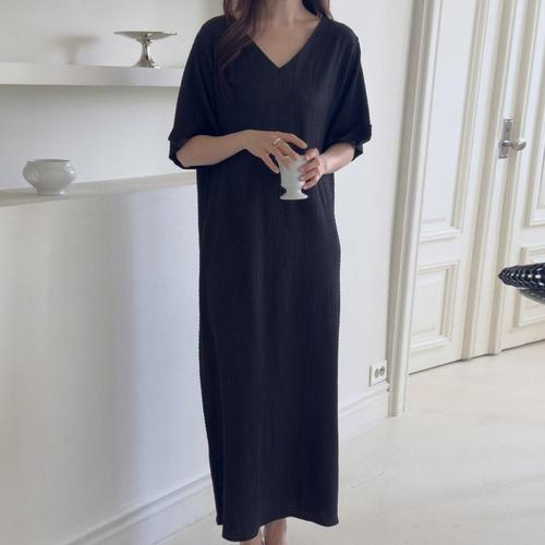 [옷자락]여자 단정한 가을하객룩 버튼 브이넥 박시핏 롱원피스