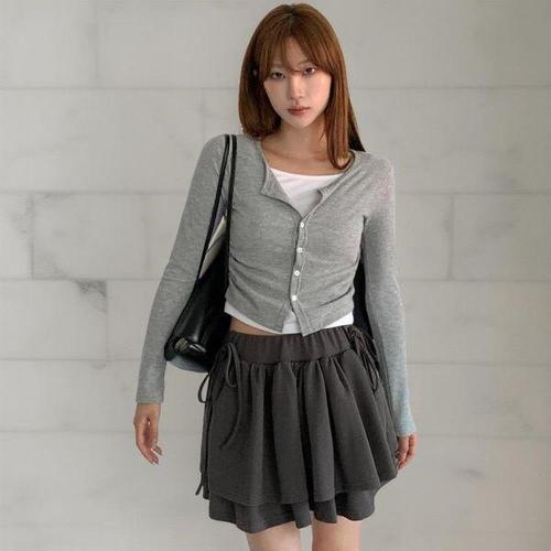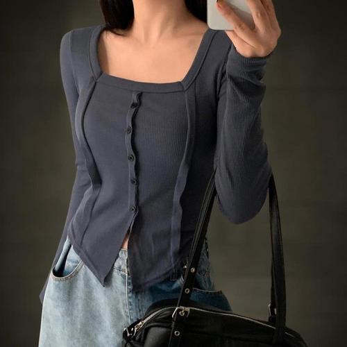 [신상오픈런]여성 스퀘어넥 긴팔 골지 크롭 티셔츠 버튼 슬림핏