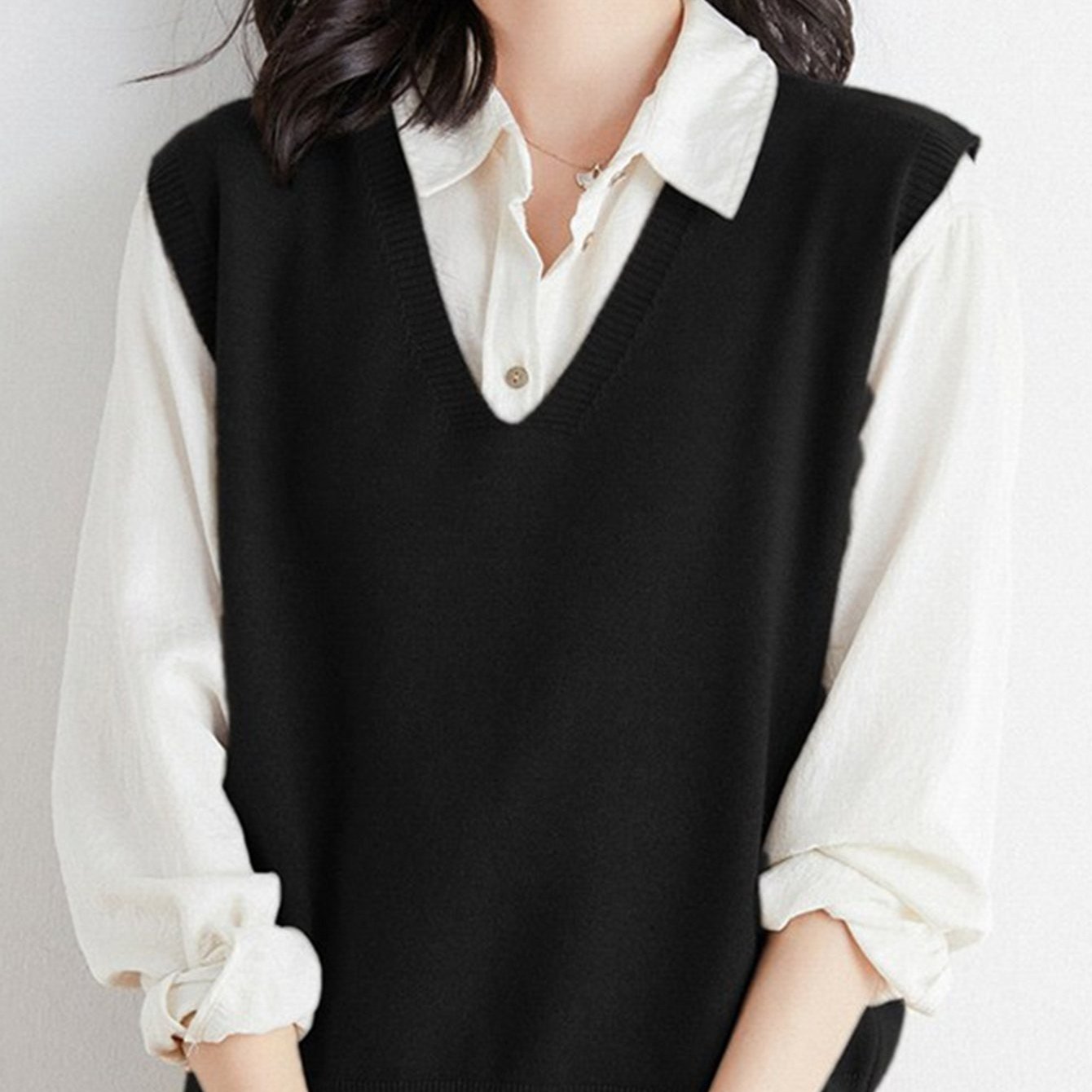 TEMU 단색 V 넥 스웨터 조끼, 봄 & 가을용 빈티지 민소매 담근 밑단 조끼, 여성 의류