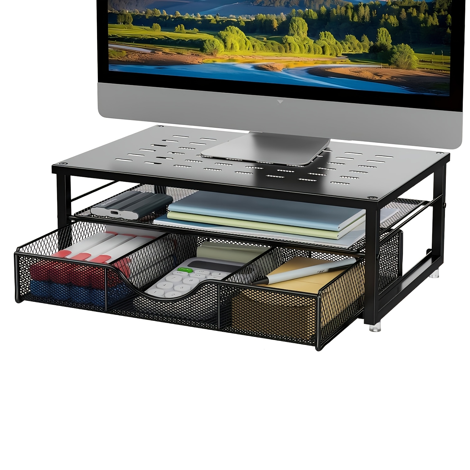 TEMU 컴퓨터 모니터 스탠드 서랍 포함, 가정 및 사무실용 데스크탑 정리함, 책상 수납 박스, 홈 스토리지용 데스크 & 서랍 정리대