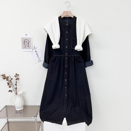 데님 여자 워싱 롱 민소매 카라 원피스 레이어드 WFLDHXJ