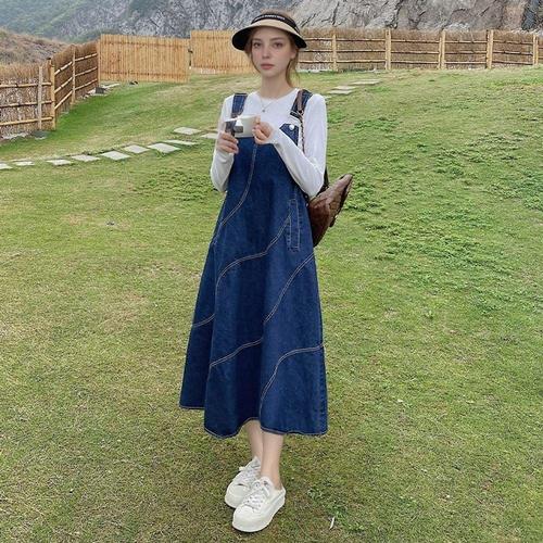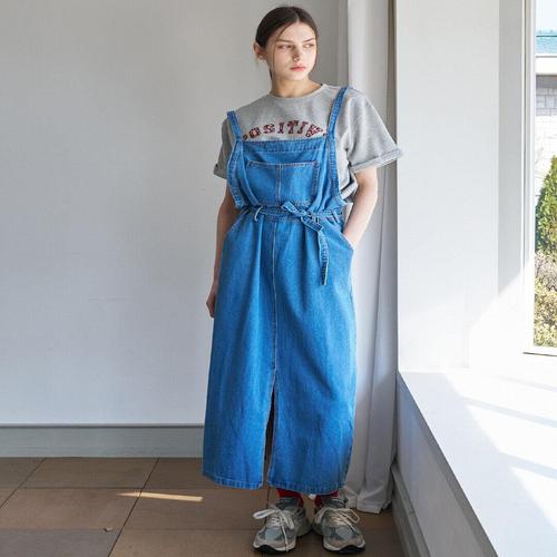 [무드무드] 니보라 데님 뒷트임 멜빵 롱 원피스