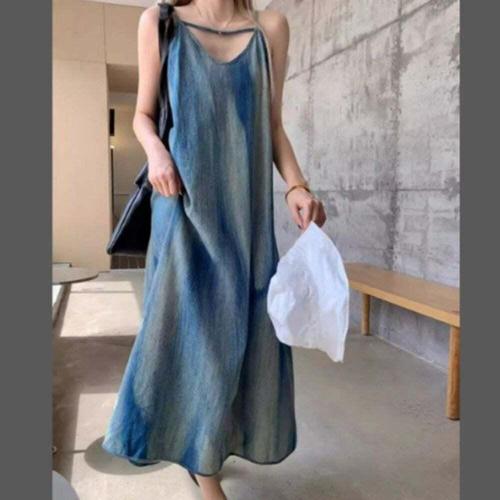 [모노무드]모노무드 여성 나염 데님 V넥 끈나시 롱원피스 1P 바캉스 비치