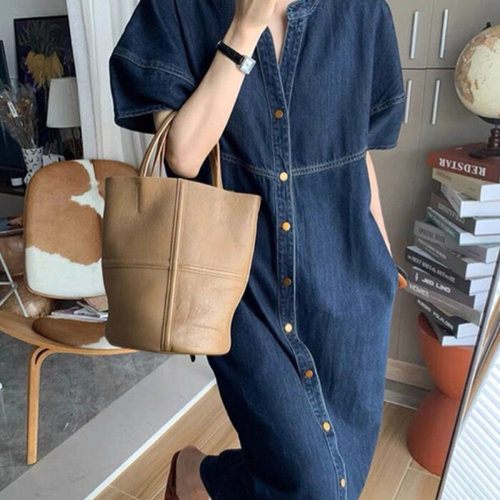 SAHINER 봄가을 여성 데님 셔츠 롱원피스 A라인 캐주얼 오버핏 LWBQZ35