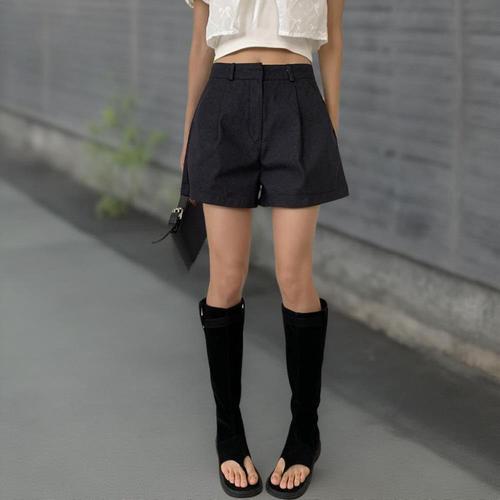 |KMP8C0C|여성 심플한 면 더블 핀턱 블랙 데님 숏팬츠