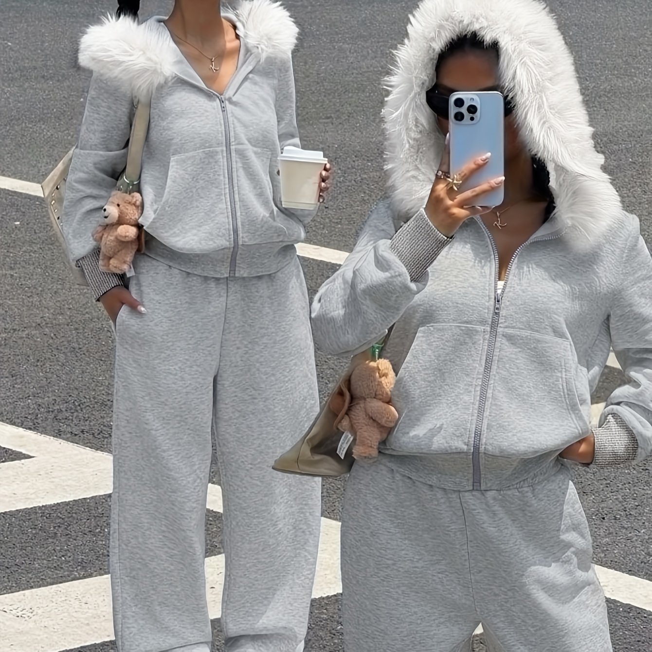 TEMU 캐주얼 가을/겨울 따뜻한 긴팔 기모 안감 후드티 (지퍼 포켓 & 와이드 레그 팬츠 여성용 투피스 세트) | 단색, 지퍼 디테일