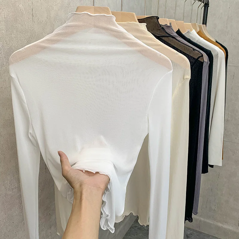 TEMU 여성용 슬림핏 러플 트림 터틀넥 탑 - 부드럽고 신축성 있는 레이어링 셔츠, 우아한 블랙 베이스 & 러플 칼라 블라우스, 봄/가을용, 재킷/드레스 아래 튜닉 길이 (캐주얼에서 포멀까지 다양한 스타일링)