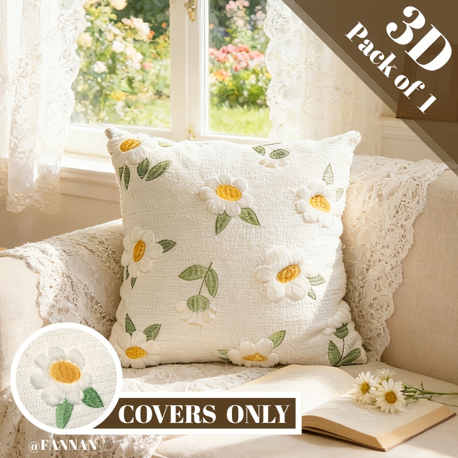 TEMU 1개 현대적인 데이지 자수 쿠션 커버, 세탁기 사용 가능, 지퍼 잠금, 폴리에스터 95%, 린넨 5%, 사계절 장식 쿠션 케이스 (다양한 방 유형용), 속통 미포함, 장식용 베개