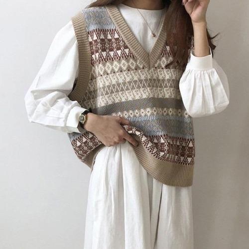 여성 유니크 패턴 브이넥 베스트 데일리 외출복