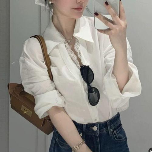 레이스 이너 포인트 루즈핏 데일리 여신 화이트 셔츠 WFL6SC8