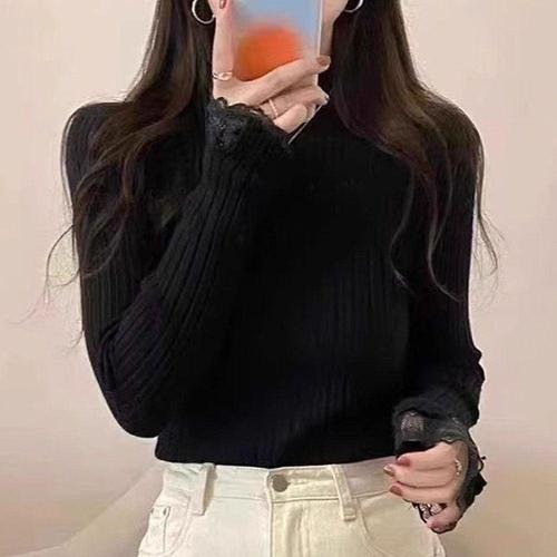 여성 골지 레이스 반폴라 포근 데일리 니트 티셔츠 WFL8Q6G