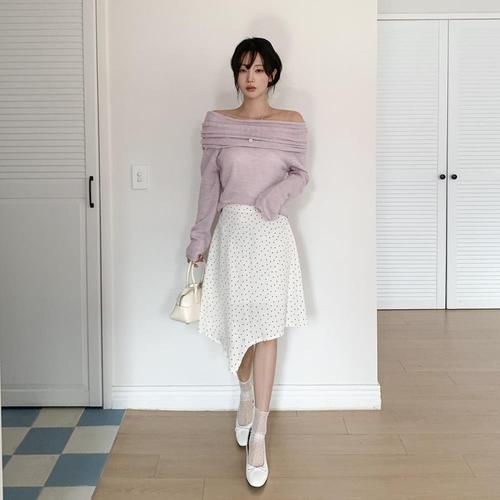 [옷자락]여자 페미닌 데이트룩 언발 도트 미디 스커트