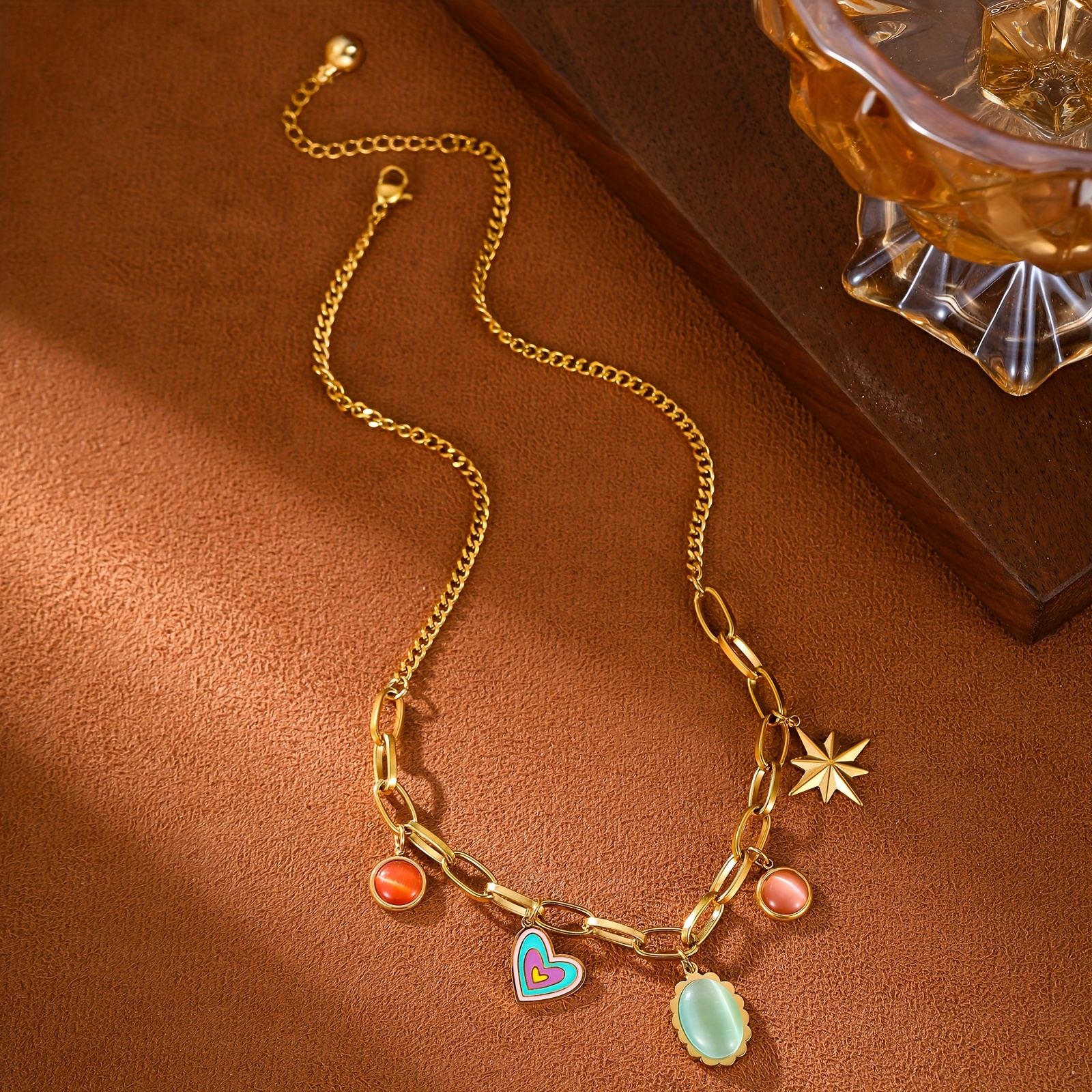 TEMU 팬시 멀티 펜던트 목걸이 - 골든톤 스테인리스 스틸 하트, 별 & 오벌 참 장식, 휴가 및 캐주얼 착용을 위한 가벼운 내구성 주얼리, 빈티지 디자인, 매력적인 액센트, 섬세한 체인 디자인 여성용