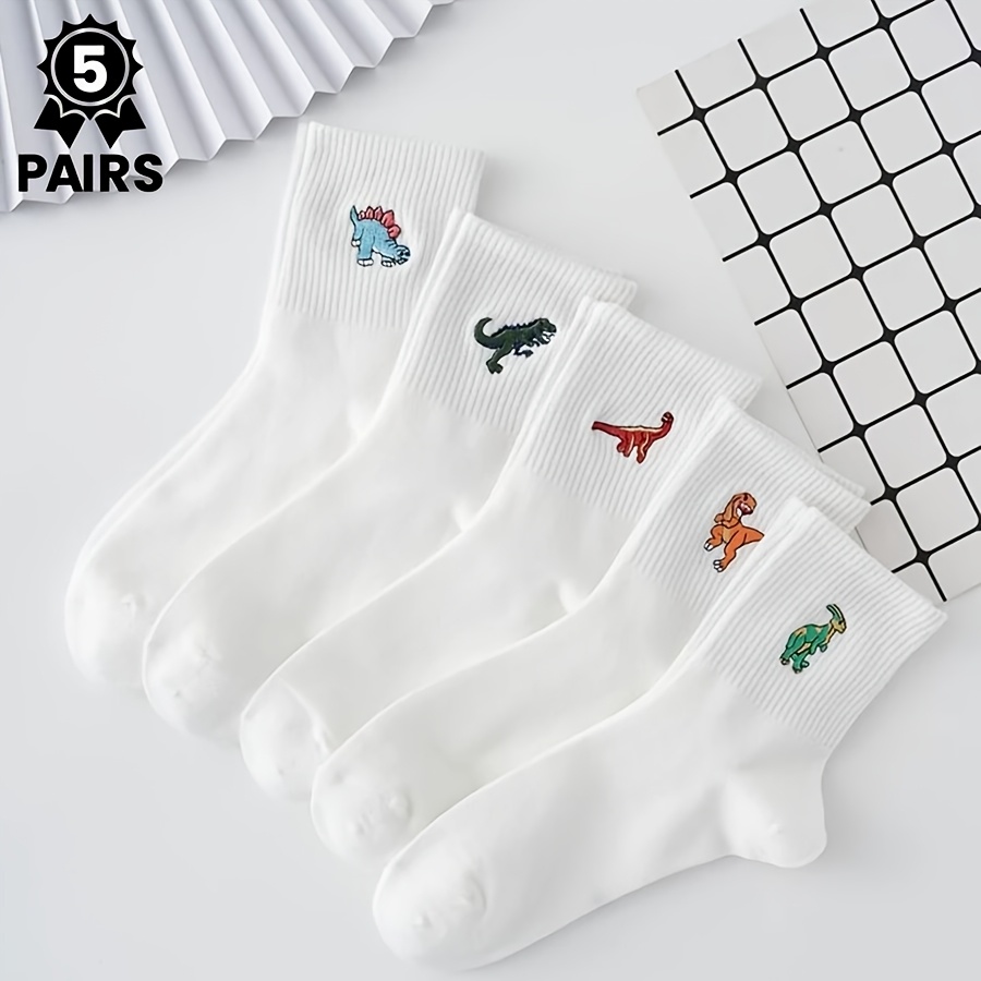 TEMU 공룡 프린트 미드 튜브 양말 5켤레 - 부드럽고 편안한 솔리드 컬러 캐주얼 양말