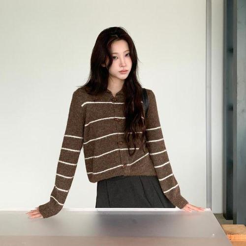 [신상오픈런]여자 심플 스트라이프 떡볶이단추 니트 가디건