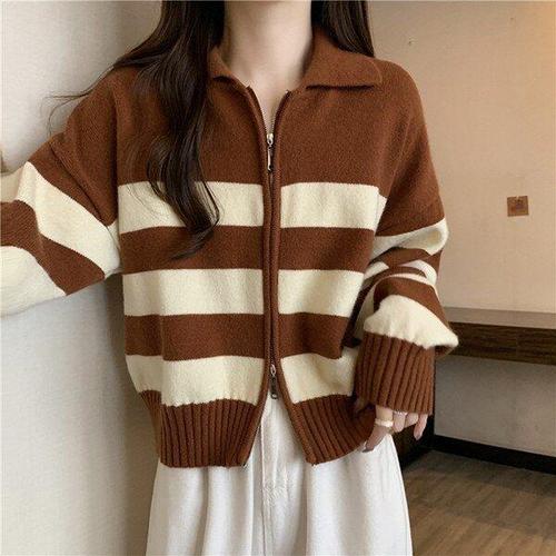 [모노무드]MNO 여성용 카디건 뜨개탑 스테디 박시핏 크롭핏가로줄
