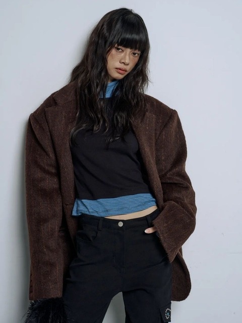 [라미] 스트라이프 샤기 기모 오버 핏 자켓 코트_브라운 COLOR