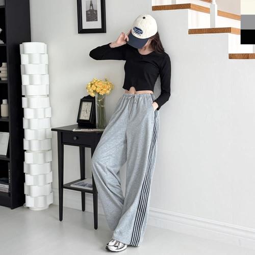 [옷자락]여성 캐주얼 트랙 사이드라인 밴딩 와이드 팬츠