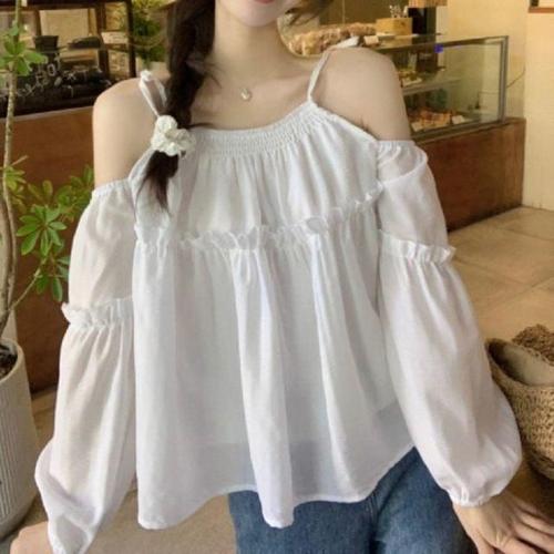 여성 레이온 스판 무지 오프숄더 셔링 스트랩 긴팔티