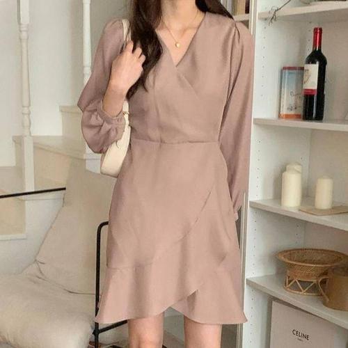 해피유통여성 봄여름 슬림 V넥 긴팔 블라우스 심플 랩 스타일bhf