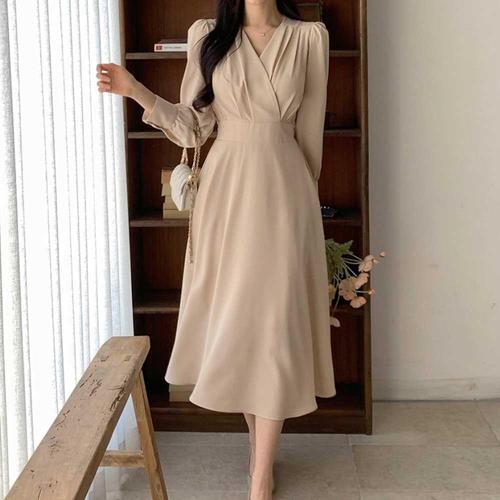 [굿쇼핑몰_의류]페미닌 랩 A라인 뒷밴딩 브이넥 퍼프 긴팔 롱 원피스