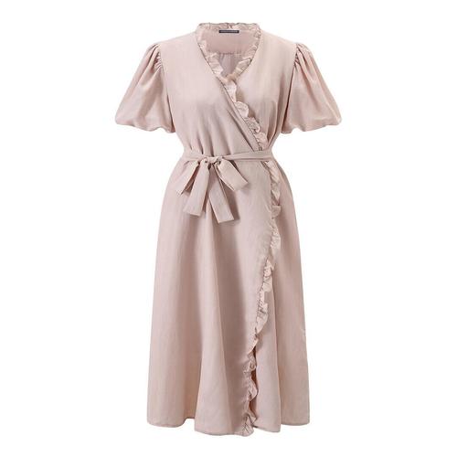 [바이어스]러플 브이넥 반팔 훌 프릴 셔링 랩 퍼프 롱 원피스 (9946844A)