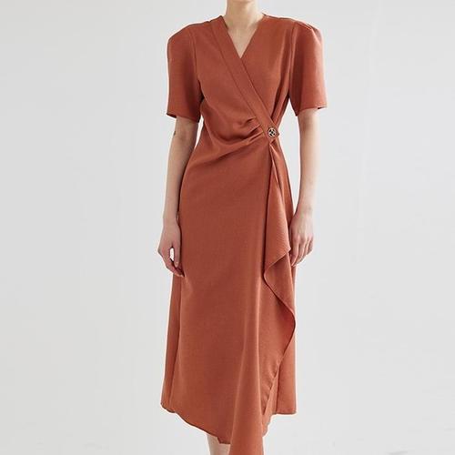 [바이어스]고급스러운 금장 여자 셔링 랩 퍼프 롱 반팔 원피스 (9972656A)