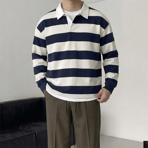 플러리싱 / 배색 럭비 스트라이프 버튼 카라넥 맨투맨 플러리싱
