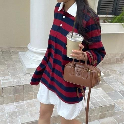 옷자락 / 여성 배색 럭비 티셔츠 오버사이즈 긴팔 카라넥 가을