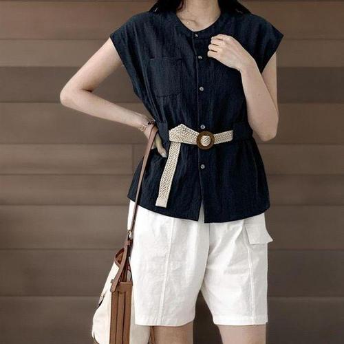 [신상오픈런]여성용 파스텔 컬러 포켓 민소매 벨트 블라우스 여름용