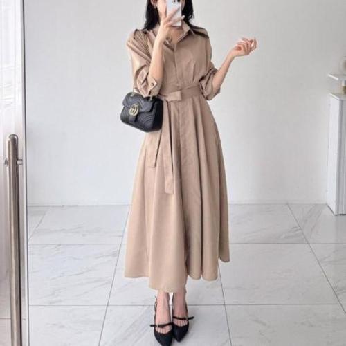 [신상오픈런]여성 클래식 허리띠 셔츠 스타일 플레어 롱 드레스