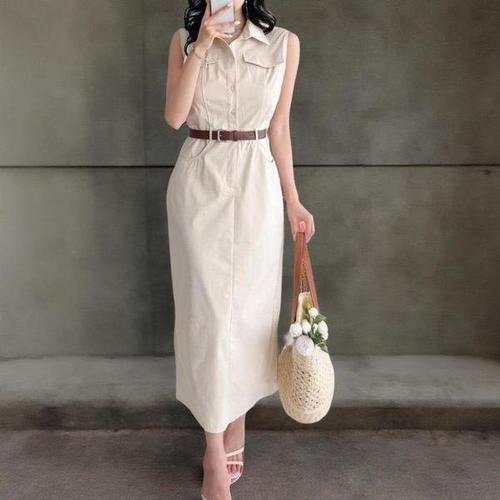 [신상오픈런]여성 클래식 벨트 카라 민소매 롱 드레스