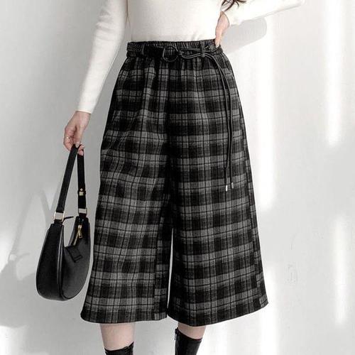 [신상오픈런]여성용 체크패턴 와이드핏 8부 팬츠 밴딩 벨트 겨울용