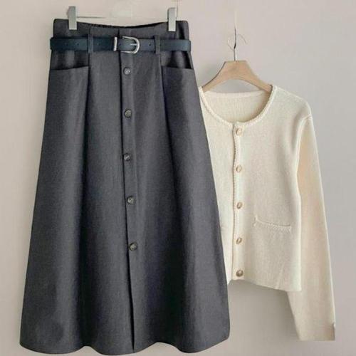 [신상오픈런]여성 단색 버튼 뒷밴딩 벨트 플레어 긴 스커트