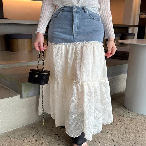 [옷자락]여자 데님 레이스 레이어드 롱 스커트