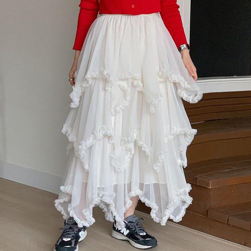 [옷자락]여자 발레코어 샤 프릴 캉캉 러블리 시스루 롱스커트
