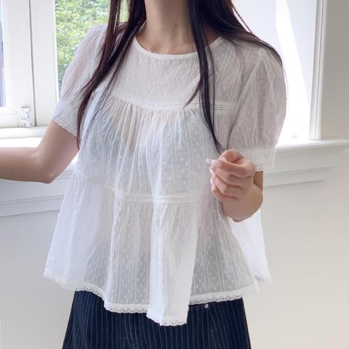 [레이어드] 리버티 시스루 펀칭 레이스 반팔 블라우스