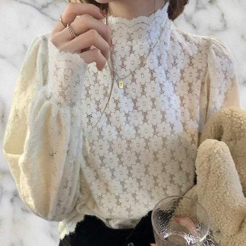 마켓피아 여성용 레이스 블라우스 하이넥 긴팔 티셔츠