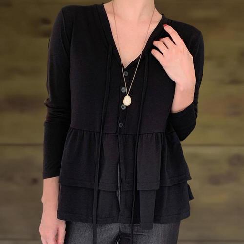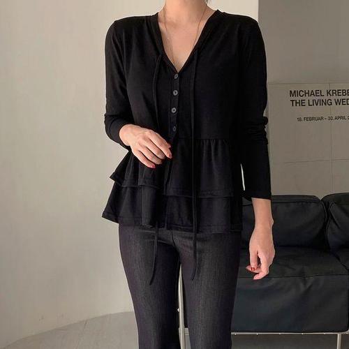 [신상오픈런]여성 버튼 프릴 레이어드 리본 브이넥 긴팔 가디건