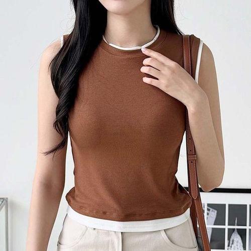 [에이치플러스몰]여성 스타일 베이직 데일리 제닐 엣지 레이어드 배색나시 티셔츠