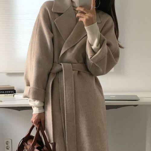[에이치플러스몰]여성 모직 롱 코트 루즈핏 로브 아우터 베이지