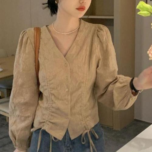 TEMU V넥 블라우스, 우아한 3/4 소매 레이스업 커프 탑, 봄 & 가을 여성 의류