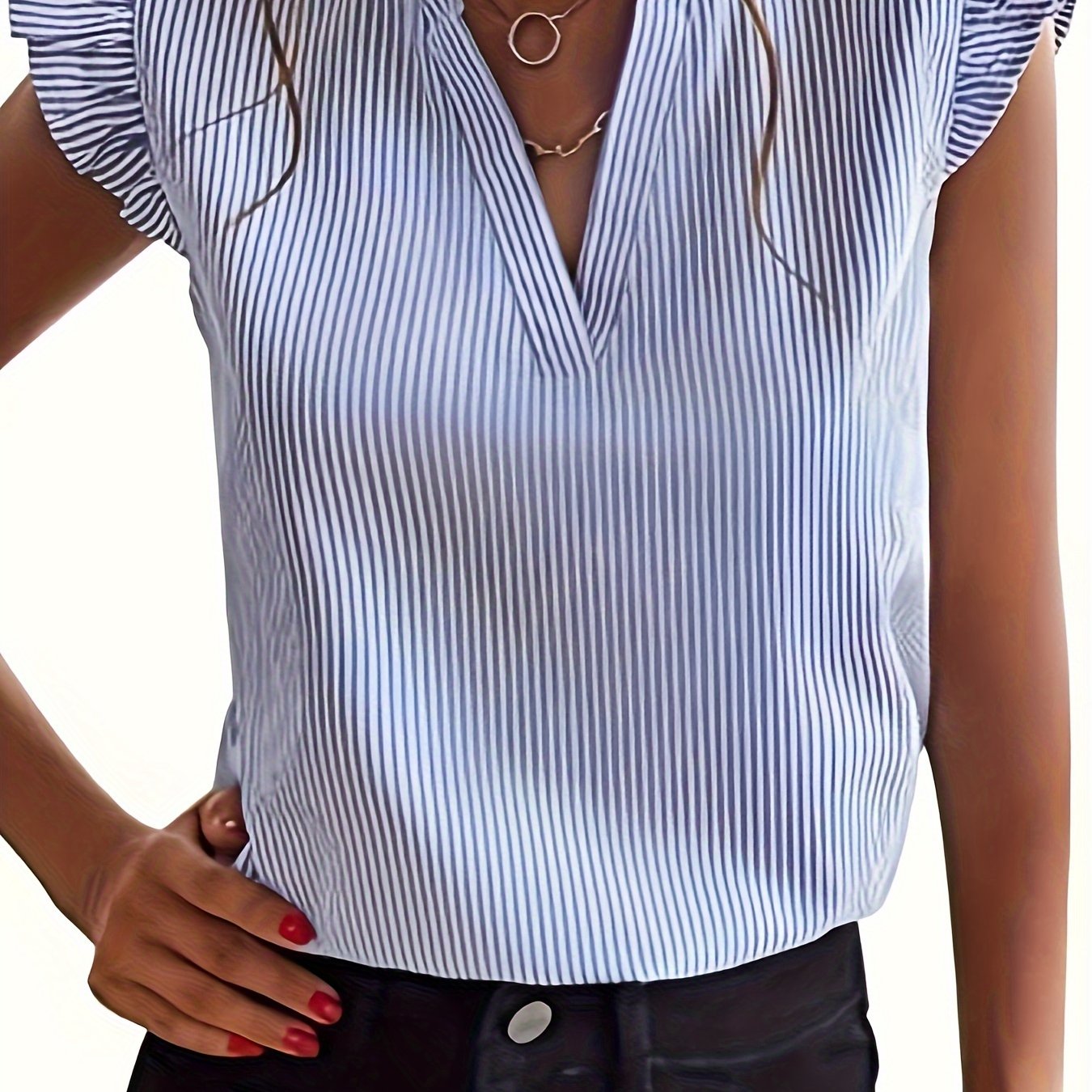 TEMU 여성용 연두색 & 흰색 줄무늬 V넥 퍼프 소매 블라우스 - 캐주얼 루즈핏 버튼업 셔츠, 여름 의상에 완벽, 캐주얼 여름복 | V넥 블라우스 | 버튼업 셔츠, 여성용 탑 및 블라우스, 여성용 셔츠 및 블라우스, 여성용 탑 블라우스, 여성용 셔츠, 여성용 블라우스, 여성용 탑 블라우스, 여성용 스타일리시 탑